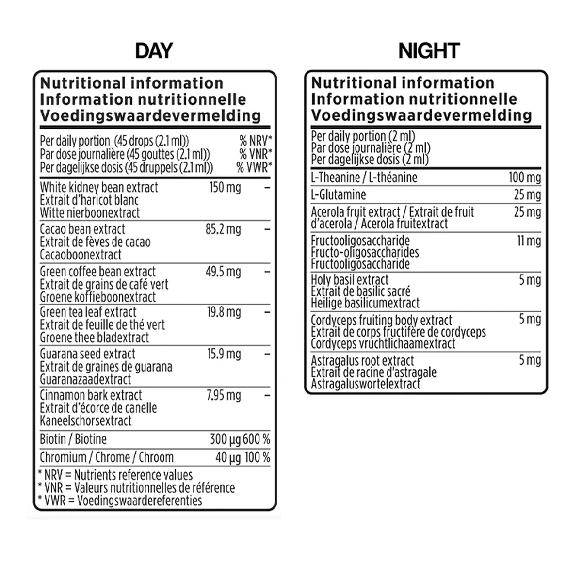 - Gouttes Jour :Eau, humectant (glycérol), extrait d’haricot blanc (Phaseolus vulgaris), édulcorant (érythritol), extrait de fèves de cacao (Theobroma cacao), arôme naturel, extrait de grain de café vert (Coffea arabica), correcteur d’acidité (acide citrique), extrait de feuille de thé vert (Camellia sinensis), extrait de graines de guarana (Paullinia cupana), extrait d’écorce de canelle (Cinnamomum cassia), conservateur (sorbate de potassium), D-biotine, chlorure de chrome (III), édulcorant (glycosides de stéviol issus de stevia).